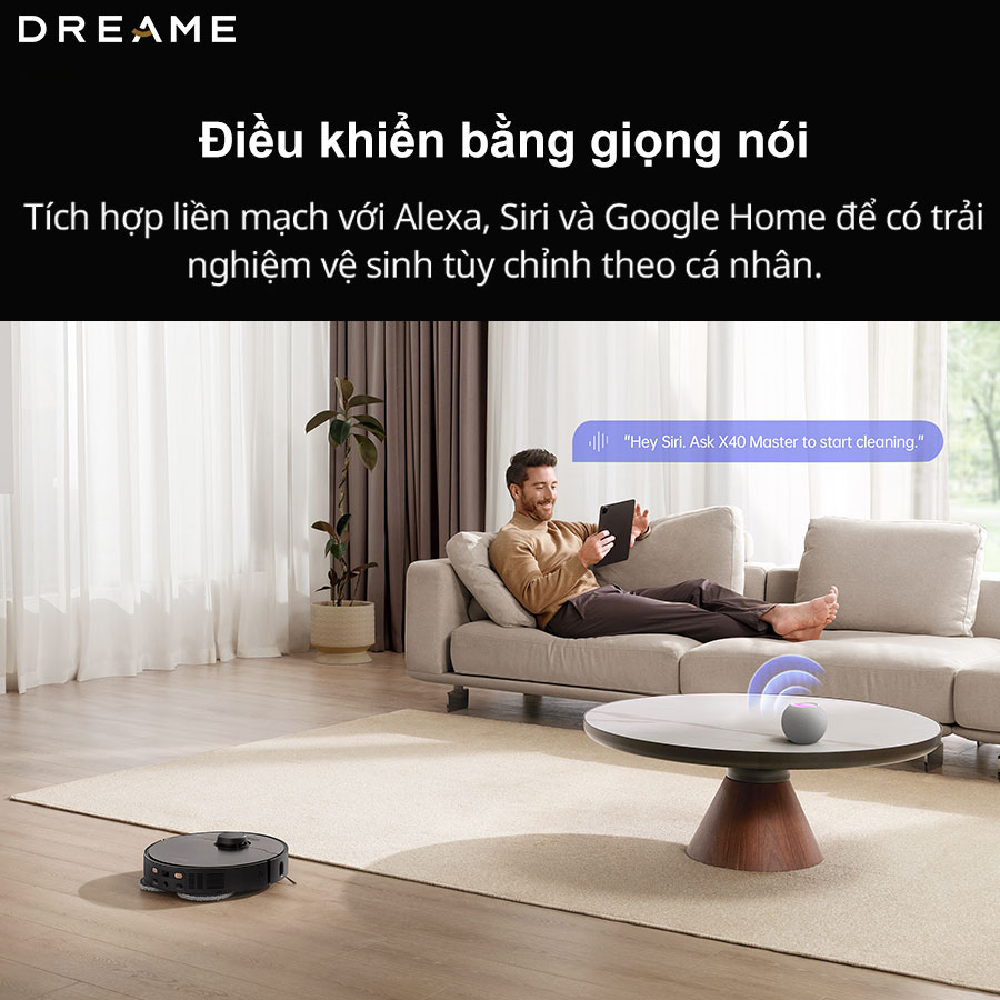 Để nâng cao sự tiện lợi, Dreame X40 Master còn hỗ trợ điều khiển bằng giọng nói. Chỉ cần nói “OK, Dreame,” robot sẽ ngay lập tức bắt đầu nhiệm vụ làm sạch nhờ vào trợ lý giọng nói thông minh tích hợp sẵn. Robot cũng dễ dàng tích hợp với các trợ lý ảo như Alexa, Siri, và Google Home, giúp bạn tận hưởng trải nghiệm làm sạch được cá nhân hóa và hiện đại hơn cho ngôi nhà của mình.