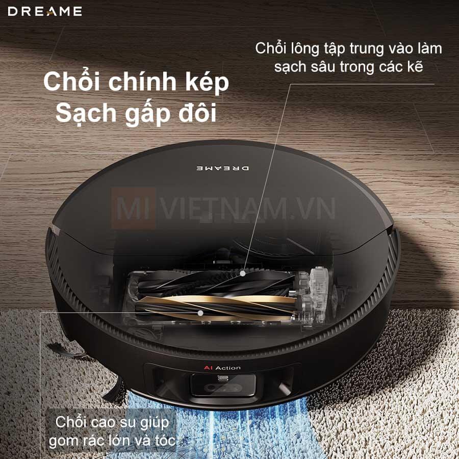 Dreame X50 Ultra được trang bị hệ thống chổi chính kép hỗn hợp, kết hợp giữa chổi lông và chổi cao su, tạo nên khả năng làm sạch toàn diện trên mọi bề mặt. Nhờ thiết kế xoay ngược chiều, hệ thống này có thể loại bỏ tóc, bụi, và rác lớn với tỷ lệ thu gom lên đến 99,99% mà không bị rối. Chổi lông đảm nhiệm việc làm sạch sâu trong các kẽ hở, trong khi chổi cao su dễ dàng gom rác lớn và tóc dài, mang đến hiệu quả vượt trội trên cả sàn cứng, thảm lông, và khe gạch.